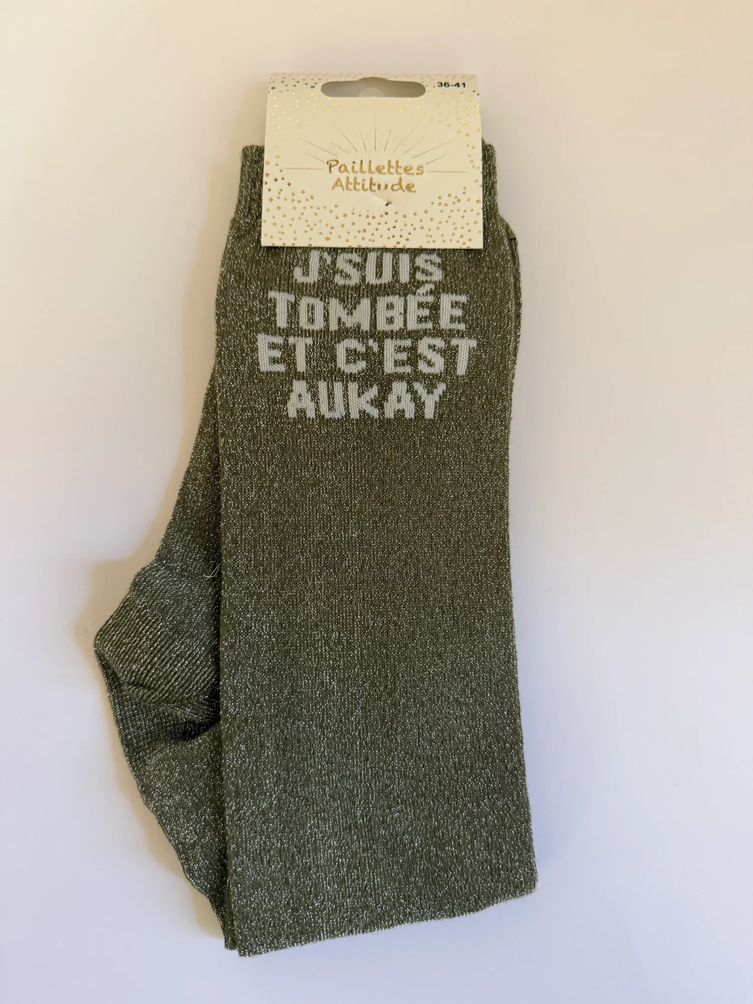 Paillettes Attitude – Chaussettes d’équitation « J’suis tombée et c’est aukay »