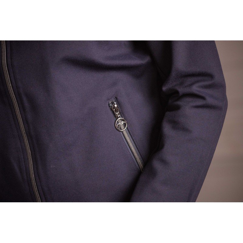 Veste légère au look sporty chic zippée sur le devant. Elle a un col montant et deux poches zippées. Elle est légèrement resserrée en bas par un élastique. Les épaules sont froncées et rehaussées d’un galon à la fois verni et brillant. Le logo Pénélope apparaît en strass sur le cœur.